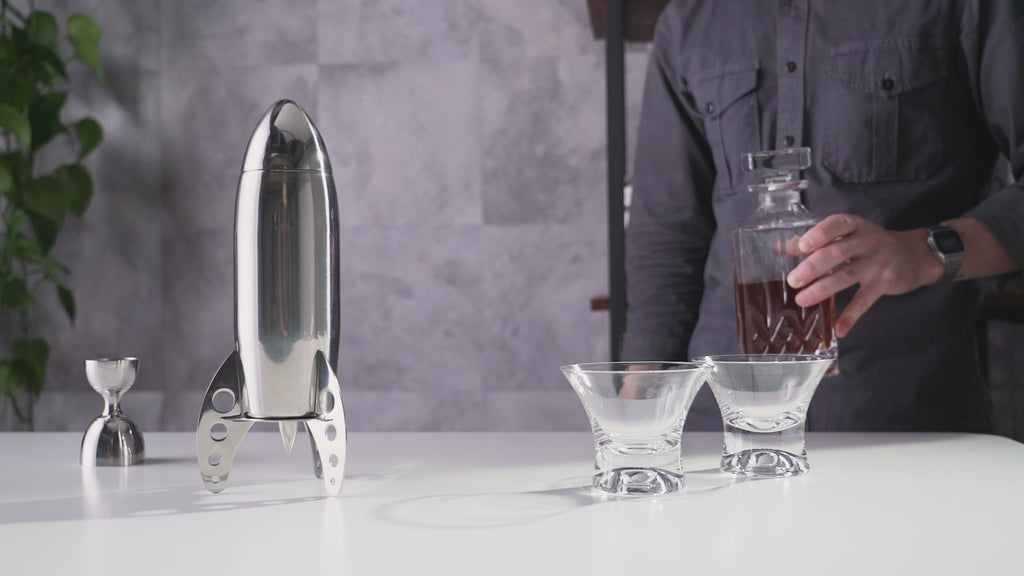 Sleek and space-worthy, our retro rocket cocktail shaker holds 24 ounces and includes a strainer, lid, capsule-esque cap, aerodynamic body, and launch-ready shaker stand.