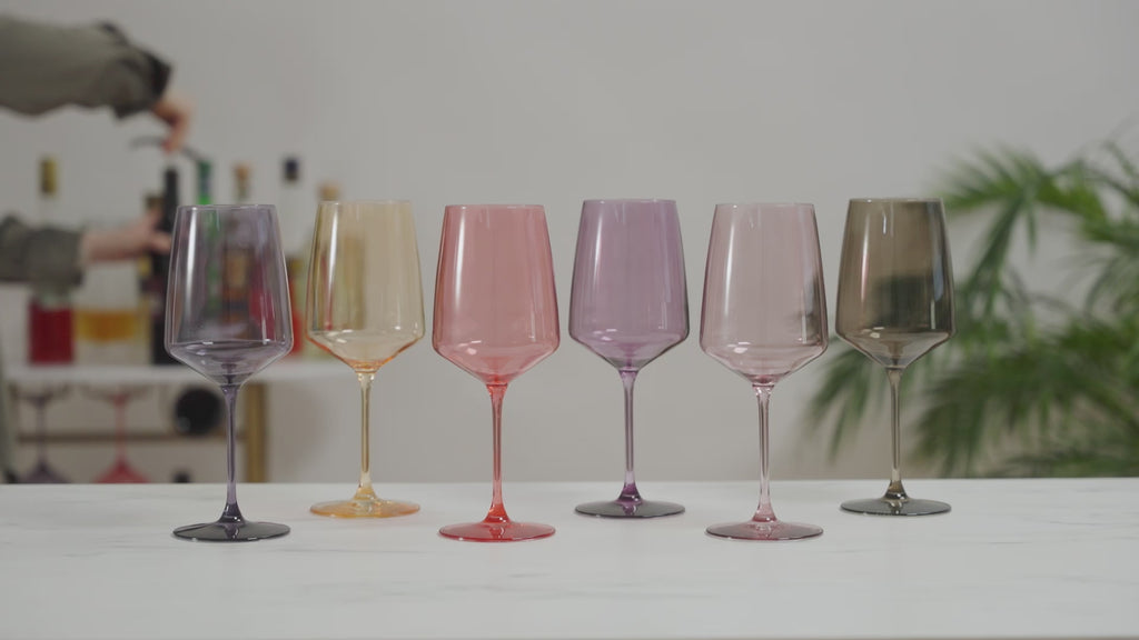 Savor your wine from a pastel perspective. Crafted from European crystal, these stemmed wine glasses have a modern, angled silhouette with elegant stems and a delicate peach hue.
