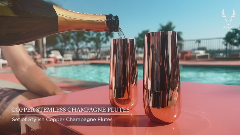 Polished and perfectly rounded to fit in the curve of your palm, these stemless champagne flutes look stunning on any tabletop. Gleaming copper plating catches the light, evoking luxury and warmth.