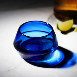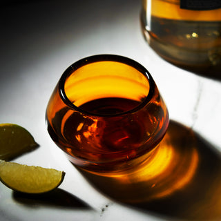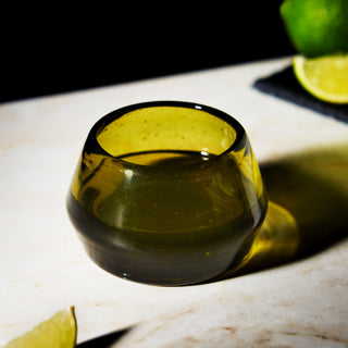 Handmade in Mexico. Inspired by traditional clay vessels for sipping mezcal, this colorful glassware is made by Mexican artisans from 100% recycled glass. Bring a pop of color to your nightcap and enjoy your favorite tequila or any spirit in these unique colored glasses.
