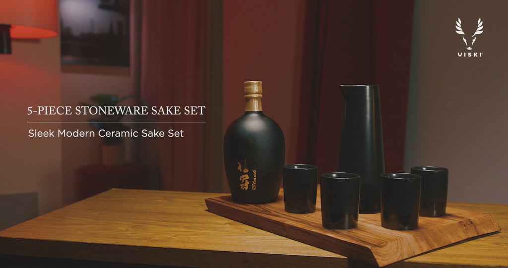Black doesn't go out of style. In our classic five-piece sake set, jet-black stoneware is overlapped by a glossy obsidian base on each piece, forming a flawless horizon across four cups and a traditional serving carafe.
