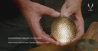 Each of the four flat-cut circles of radiant brass is expertly shaped with a series of striking blows, resulting in a glittering set of four hammered coasters. Backed with black velvet, each one captures light anywhere from a dark wood desk to a fireside coffee table.