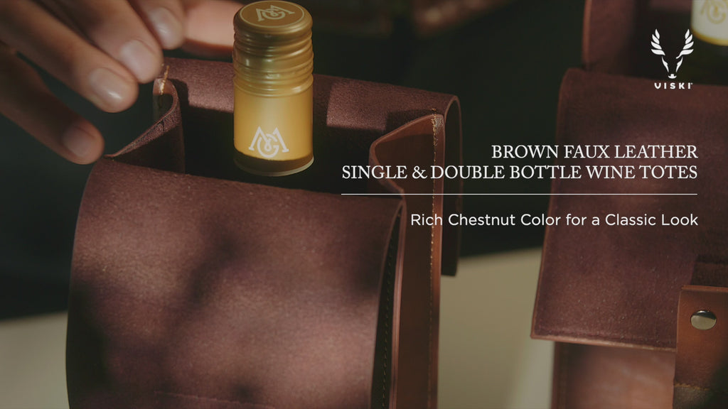 Inspired by travel from city to bustling city, our chestnut-colored faux leather double bottle carrier replaces flimsy bottle bags with something that will stand up to a tireless lifestyle. Features a snap closure, velvet cushioned divide and one sturdy metal handle.